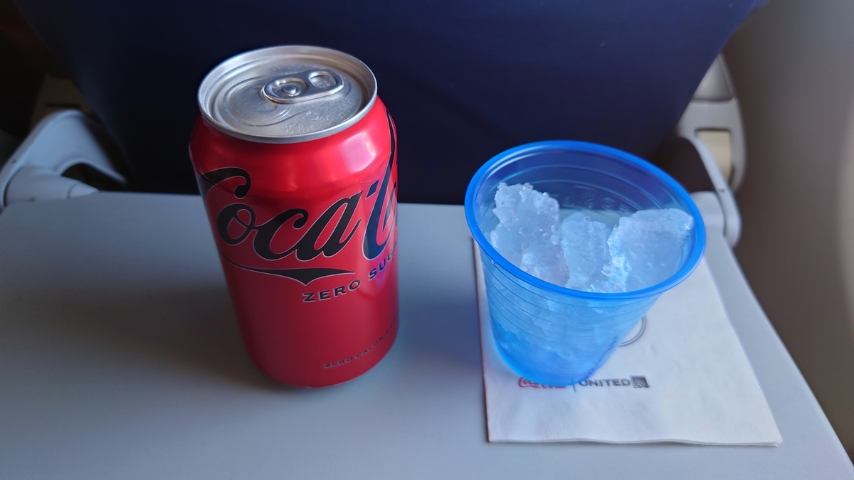 お菓子から20分ほど遅れて飲み物も配られました。カップに氷まで入れてくれるのはありがたい。日本だとお菓子は配られないですし、氷は入れてくれないので、この点だけ見れば意外とサービス悪くないです。